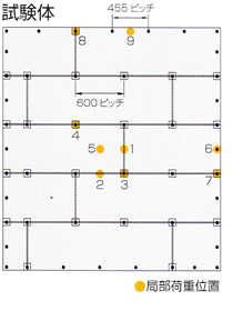 一般家庭で、積載荷重の大きなものとしては本棚が考えられますが、かなり大きな本棚の荷重(中身含む)は、200/300mm×900mm程度です。これを模擬した試験として局部荷重の試験があり300mm×900mmの各荷重点に荷重を加え、荷重と変位の関係を測定するものです。 |