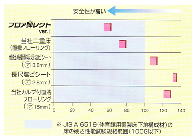 特殊形状の新開発クッションゴムが適度な弾力性と二重床同等以上の転倒時の安全性・居住性を実現しました。足腰の弱いお年寄りや遊び盛りのお子様にもやさしい床材です。福祉施設、幼稚園、保育園などにお奨めです。 <フロア弾レクトの2大特性> 1. 安全性能(床の硬さ試験による比較) 転倒時の安全性に関しては、体育床におけるJIS規格「床の硬さ試験」が目安になります。当商品はその規格値を満たした安全設計です。 (試験方法)JIS A 6519所定の試験方法(床の硬さ試験は人間の頭部をモデル化した 2. 耐荷重性能 (荷重面積) 特殊形状ゴムの機能